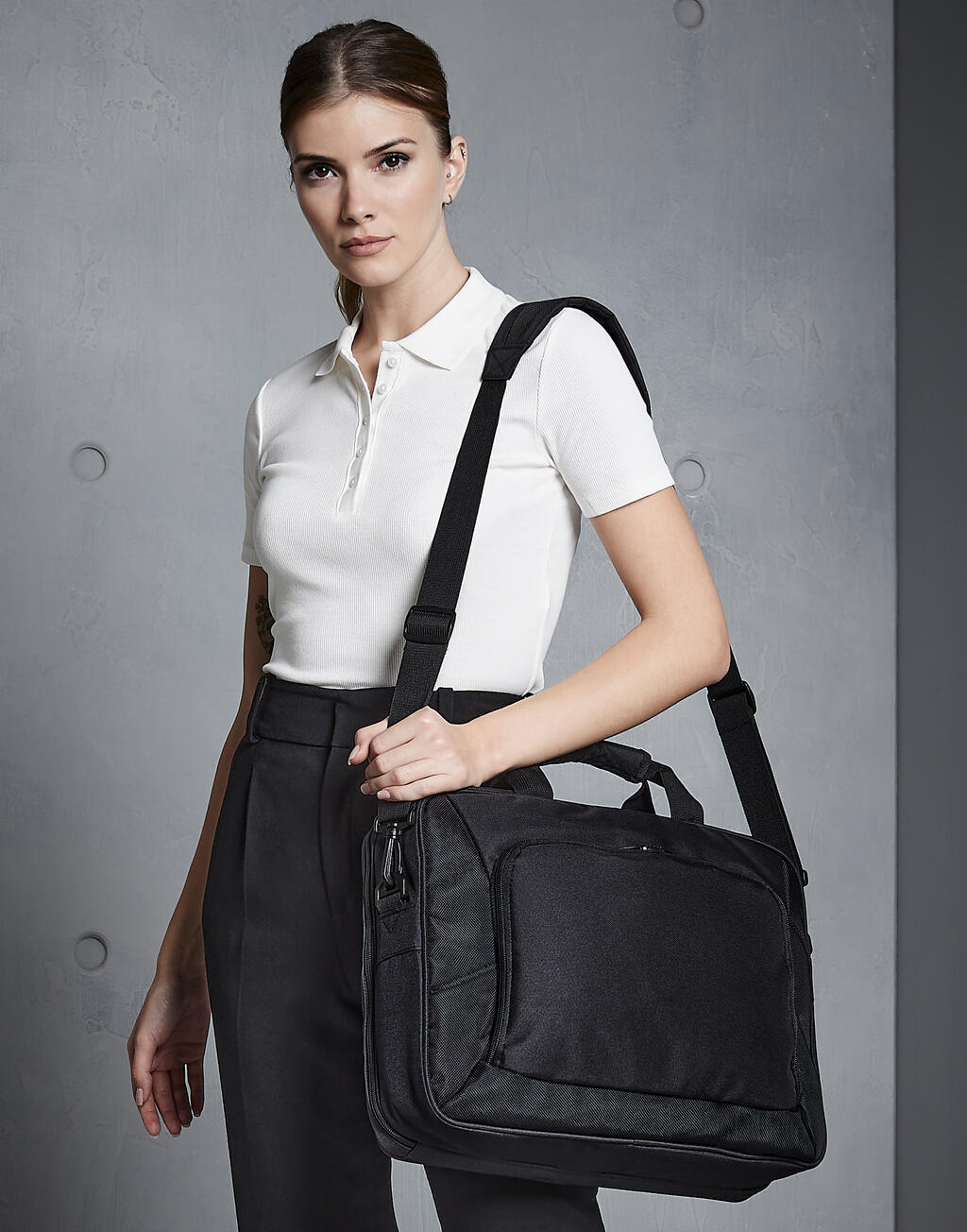 ·100% polyester (600D/1680D) ·Gevoerd handvat ·Gevoerd laptop compartiment met rits, laptop tot 17 ·Document vak met rits ·Voorzak met rits ·Organiseervak ·USB stick lussen ·Tasriem ·Inhoud : 13 liter ·Afmetingen : 41 x 30 x 14 cm ·Maximum borduuroppervlak : 18 platte hoepel ·Maximum drukoppervlak : 22 x 18 cm