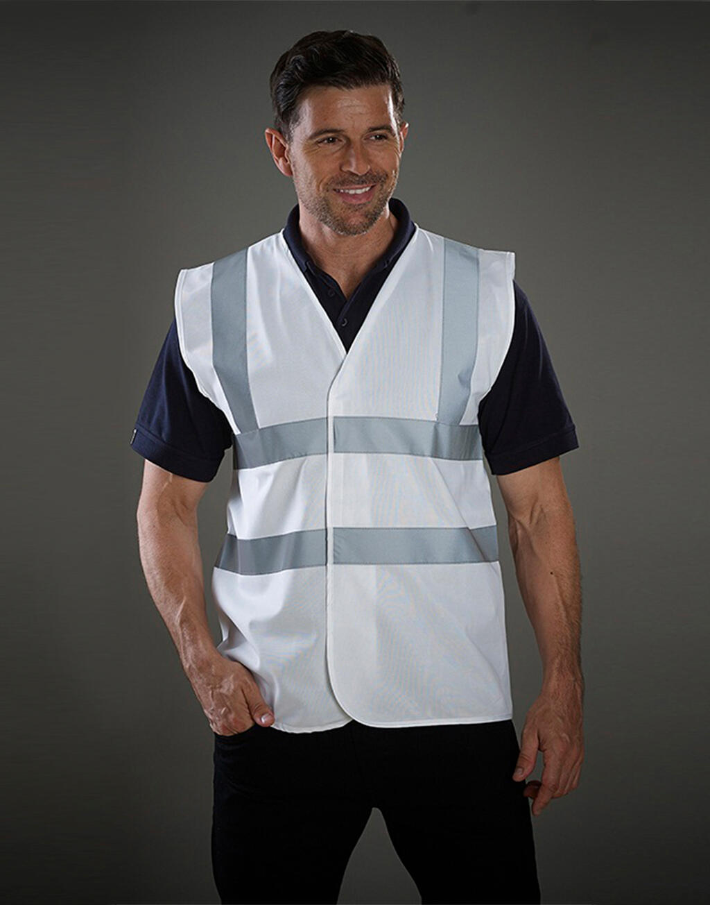 ·120 g/m² ·100% polyester ·veiligheidsjas met reflecterende verticale en horizontale strepen op voor- en achterkant ·practische rip-stripsluiting aan de voorkant.